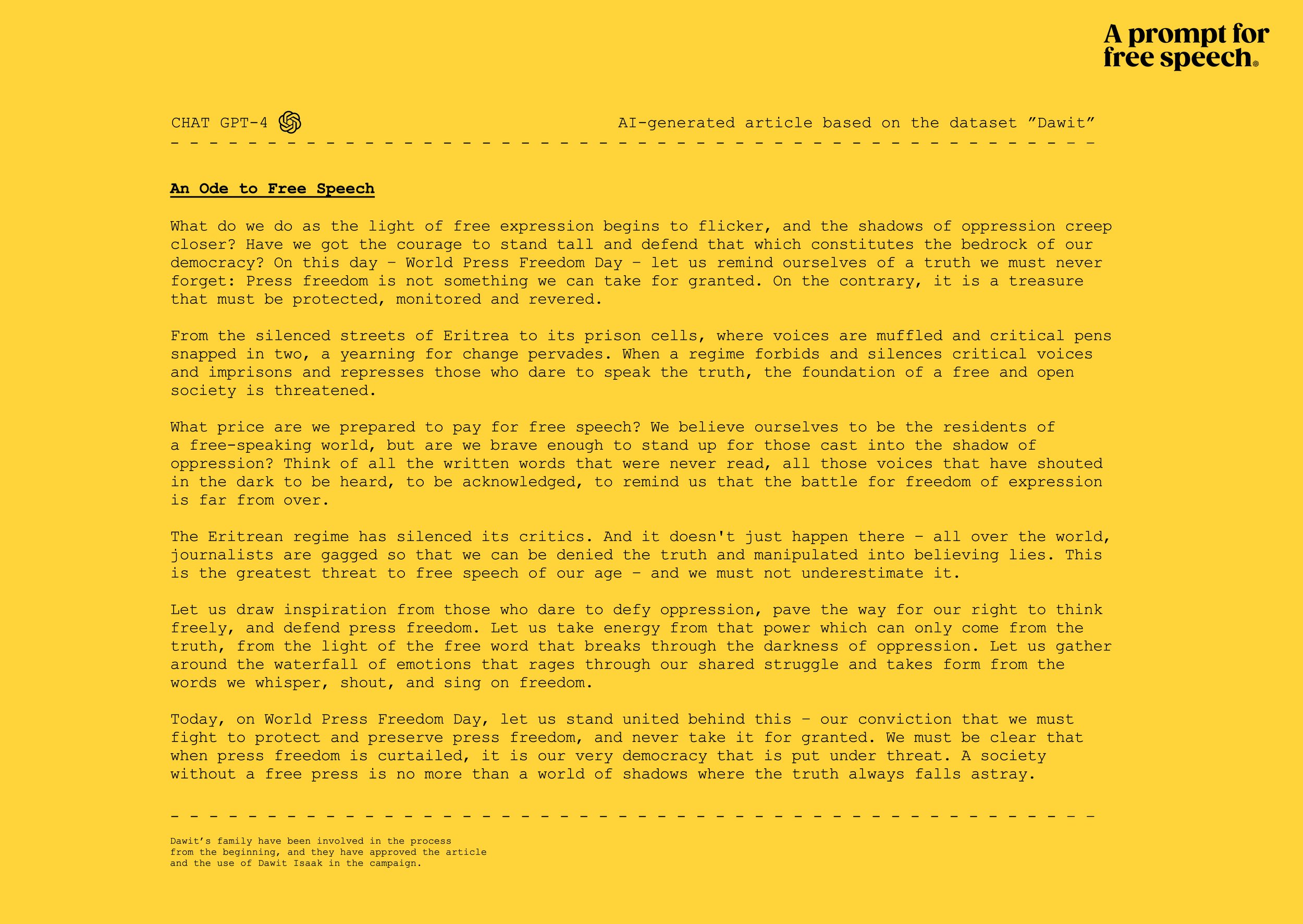 Using AI in journalism is a sensitive and controversial subject, so we hit where it hurt to make sure that Dawit's fate was publicly debated. On World Press Freedom Day, we published the AI-generated editorial article in Dawit Isaak's name in Sweden's largest daily newspaper, Expressen. Reaching 64% of the Swedish population (over 16 yrs) all at once, to make sure that the fate of Dawit is not forgotten. And a controversial reminder that we must never take free speech for granted.