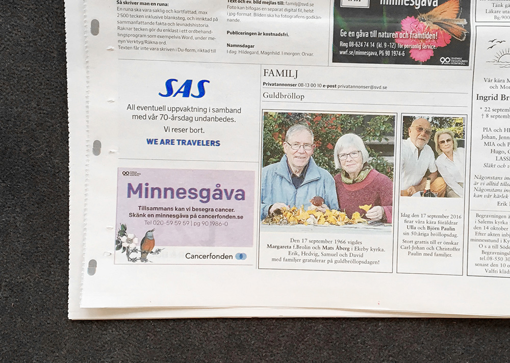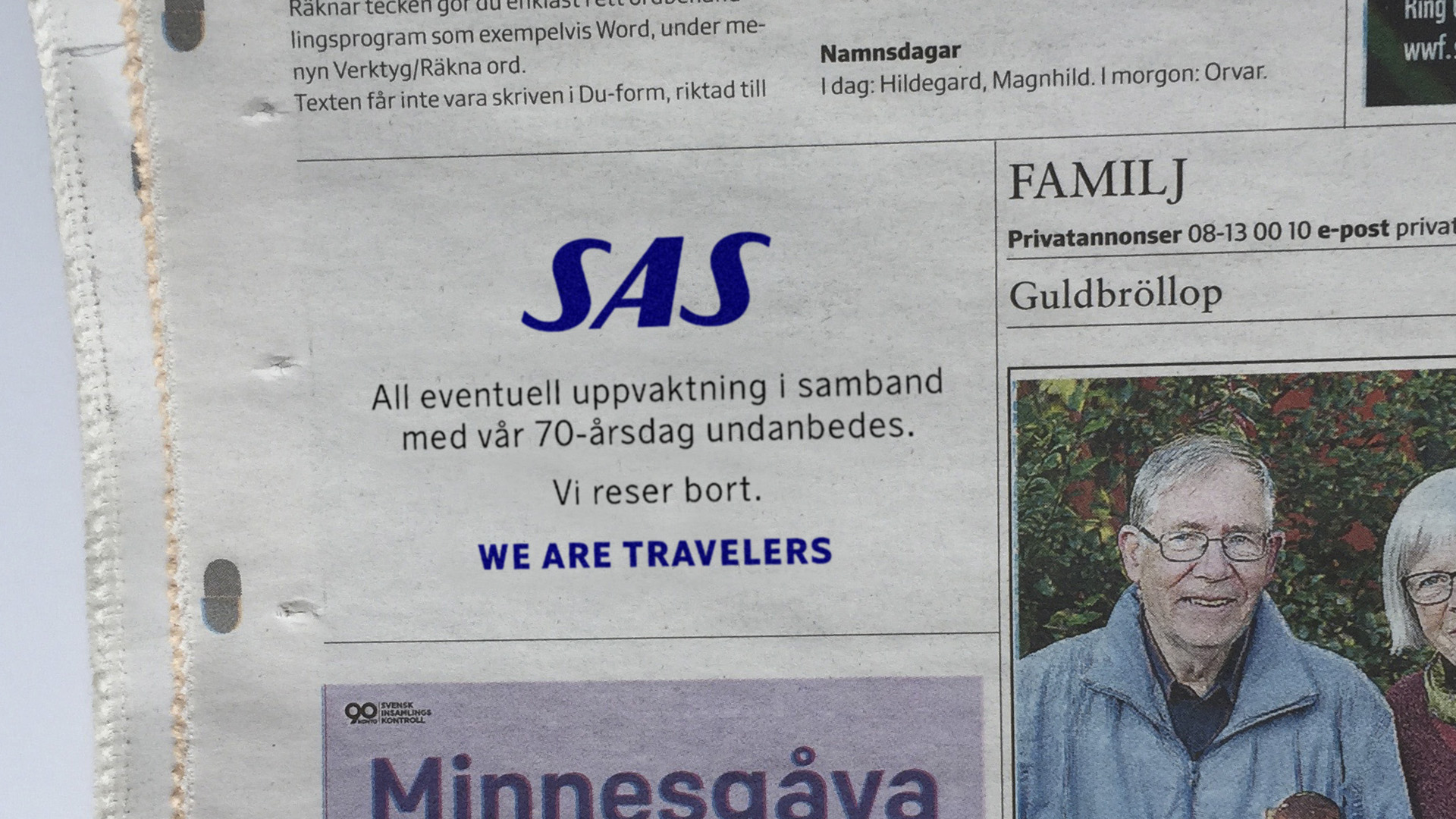 2016 fyllde SAS 70 år. För att uppmärksamma detta satte vi in en liten notis i tidningen, med ett budskap i sann We are travelers anda. Annonsen fick diplom i Guldägget 2017.